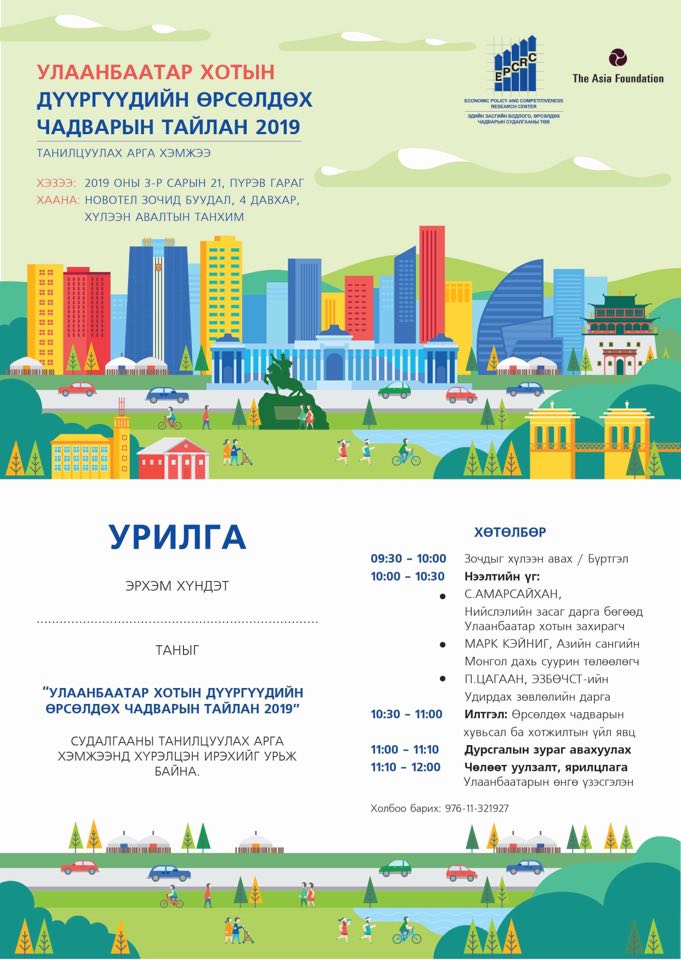 “Дүүргүүдийн өрсөлдөх чадварын тайлан-2019” судалгаа хоёр дахь жилдээ гарлаа. Энэ судалгааны тайлангийн нээлтийн хэлэлцүүлэг маргааш Новотел зочид буудлын хурлын танхимд 10.00-12.00 цагийн хооронд болох юм байна.