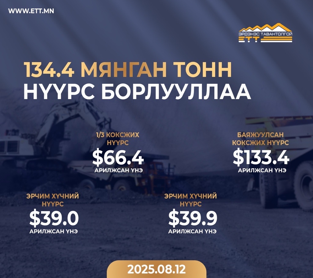 "Эрдэнэс Тавантолгой" ХК 2025 оны 8 дугаар сарын 12-ны өдөр Монголын Хөрөнгийн Биржээр дамжуулан 4 удаагийн арилжаагаар 19.2 мянган тонн баяжуулсан коксжих нүүрс, 64.0 мянган тонн 1/3 коксжих нүүрс, 51.2 мянган тонн эрчим хүчний нүүрс, нийт 134.4 мянган тонн нүүрс БНХАУ-ын Ганцмод боомт хүргэж өгөх нөхцөлөөр амжилттай арилжааллаа. Баяжуулсан коксжих нүүрсний арилжаа өрсөлдөөнтэй болж үнийг 11.5%-иар өсгөж 133.4 ам.долларт хэлцэл хийгдсэн бол 1/3 коксжих нүүрс болон эрчим хүчний нүүрсний үнийн хувьд 66.4 ам.доллар болон 39.0 ам.долларт тус тус хэлцэл хийгдлээ. Компани биржийн арилжааг эрчимжүүлэх, нүүрсний борлуулалтыг нэмэгдүүлэхэд онцгой анхаарч шат дараатай арга хэмжээнүүдийг авч хэрэгжүүлж байна. Онцгой дэглэм тогтоосноос хойш 1 сарын хугацаанд биржээр 16 удаагийн арилжаа амжилттай хийж 45.9 сая ам.долларын үнэлгээ бүхий 774.4 мянган тонн нүүрс борлуулаад байна.
