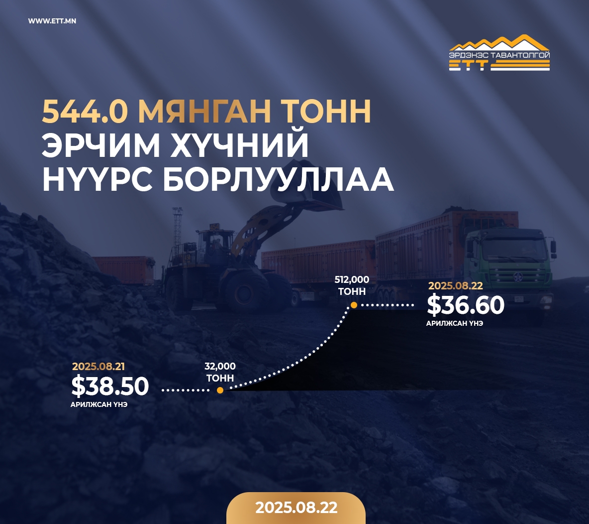 "Эрдэнэс Тавантолгой" ХК 2025 оны 8 дугаар сарын 21-ний өдөр Монголын Хөрөнгийн Биржээр дамжуулан 5 багц буюу 32.0 мянган тонн эрчим хүчний нүүрс 38.50 ам.доллароор, 8 дугаар сарын 22-ны өдөр 80 багц буюу 512.0 мянган тонн эрчим хүчний нүүрс 36.60 ам.доллароор, БНХАУ-ын Ганцмод боомт хүргэж өгөх нөхцөлөөр тус тус амжилттай арилжааллаа. “Эрдэнэс Тавантолгой” ХК ордын нөөцийг бүрэн ашиглах, сорчлохгүй жигд борлуулах бодлого баримталж эрчим хүчний нүүрсний борлуулалтыг нэмэгдүүлсэн. 2025 оны 08 сарын 01-нээс 22-ний өдрийн хооронд нийт 19 удаагийн арилжааг амжилттай зохион байгуулж 90.9 сая ам.долларын үнэлгээ бүхий 1.7 сая тонн нүүрс Монголын Хөрөнгийн Биржээр арилжаалсны 61%-ийг (1.03 сая тонн) эрчим хүчний нүүрс, 34% (576 мянган тонн) 1/3 коксжих нүүрс, 5%-ийг (77 мянган тонн) баяжуулсан нүүрс тус тус эзэлж байна.