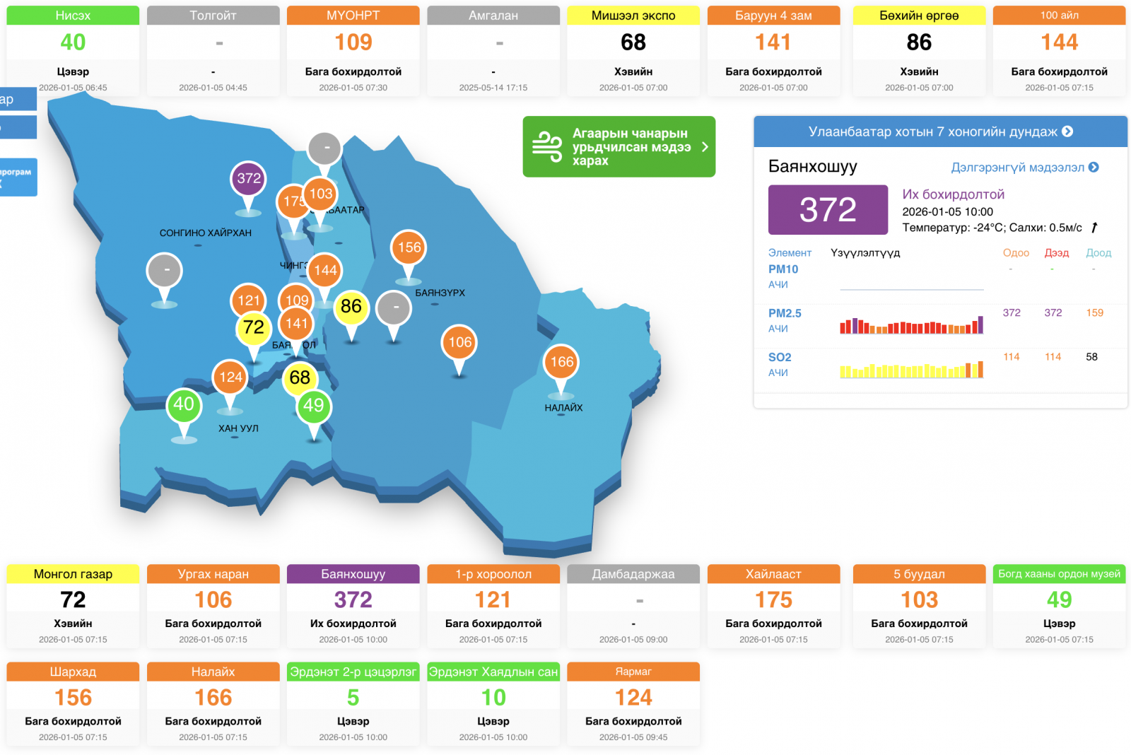 Агаарын чанарын индексийн хэмжилтийг заадаг agaar.mn сайтад мэдээлж буйгаар /2026.01.05/ өнөөдөр 10:00 цагийн байдлаар Баянхошуу ойр орчим агаарын их бохирдолтой байна. Харин Амгалан, Толгойт, Дамбадаржаа агаар хэмжигчийн мэдээлэл ирээгүй байна.
