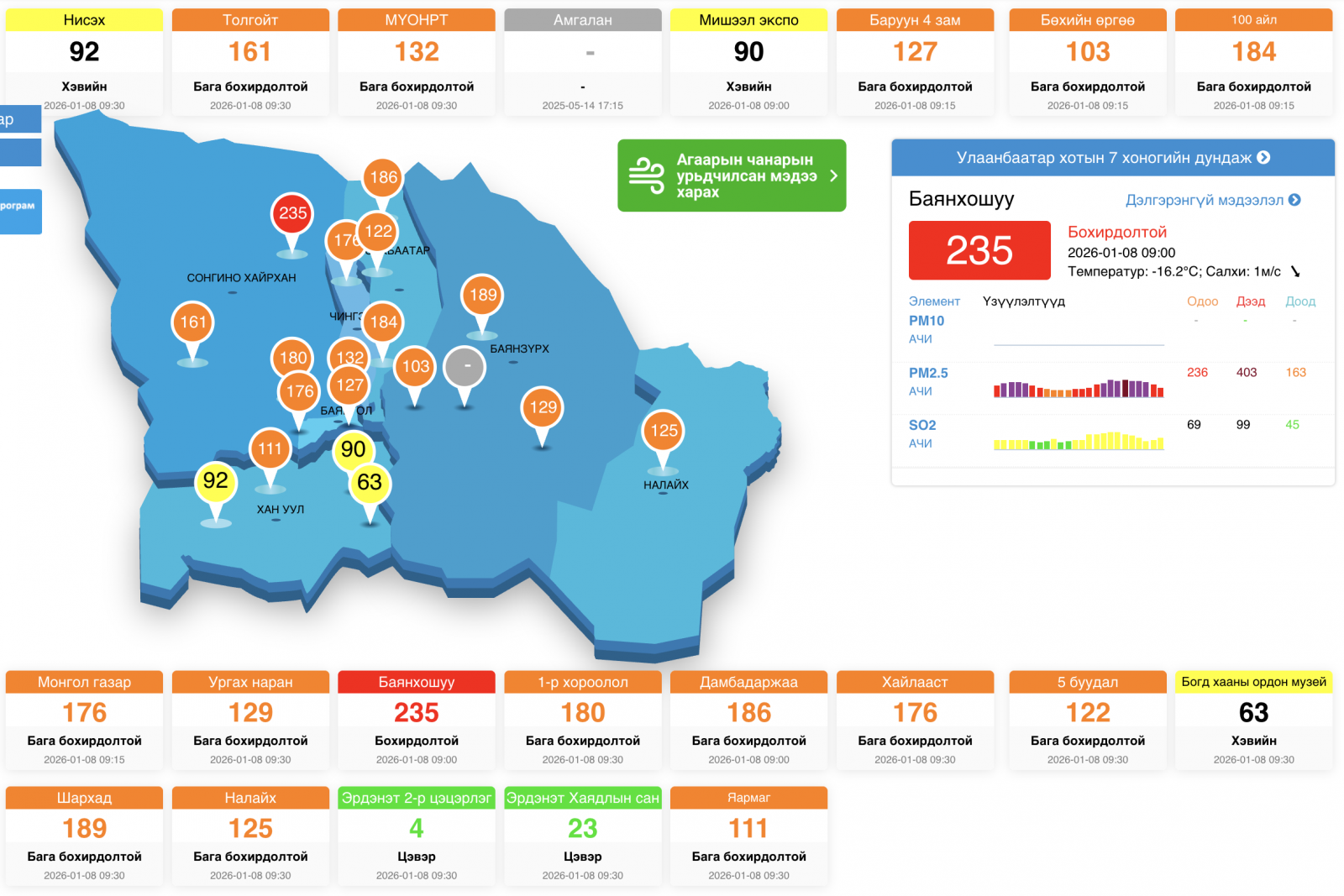 Агаарын чанарын индексийн хэмжилтийг заадаг agaar.mn сайтад мэдээлж буйгаар /2026.01.08/ өнөөдөр 09:00 цагийн байдлаар Баянхошуу ойр орчим агаар бохирдолтой байна. Харин Амгалангийн агаар хэмжигчийн мэдээлэл ирээгүй байна.