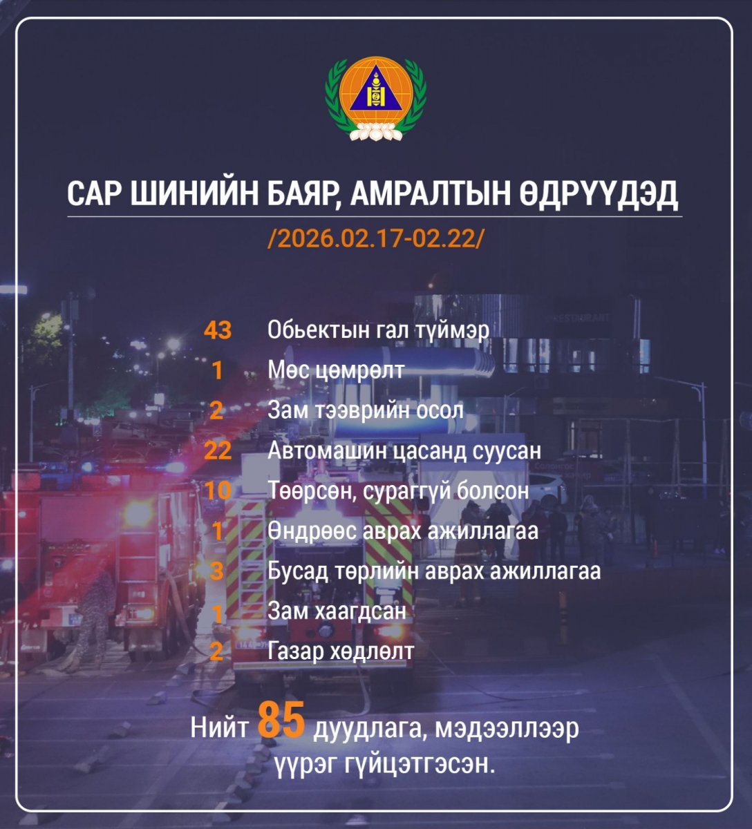 Монгол түмний уламжлал сар шинийн баяр, амралтын өдрүүдийг тохиолдуулан Онцгой байдлын байгууллагын хэмжээнд 2026 оны 02 дугаар сарын 17-ний өдрөөс 02 дугаар сарын 22-ны өдрийг хүртэл албаны өндөржүүлсэн бэлэн байдлын зэрэгт шилжин ажиллалаа.