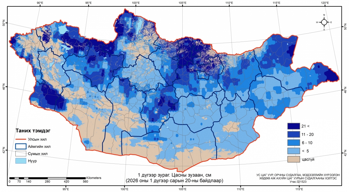 Ус цаг уур, орчны судалгаа, мэдээллийн хүрээлэнгээс арав хоногт нэг удаа хийдэг хээрийн цасны хэмжилтийн мэдээгээр хоёрдугаар сарын 20-ны байдлаар нийт нутгийн 70 хувьд цастай байна.