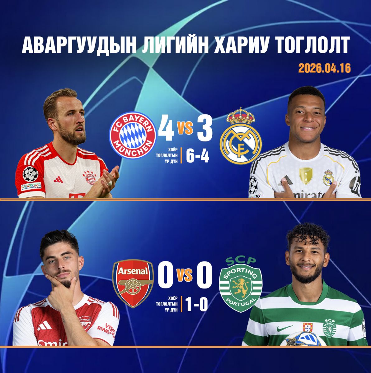 Хөлбөмбөгийн хамгийн нэр хүндтэй тэмцээн болох Аваргуудын лигийн шилдэг найман багийн хариу тоглолтууд өнгөрсөн шөнө боллоо. Английн "Арсенал" талбайдаа Португалын "Спортинг" клубтэй тоглож хуурай тэнцлээ. Улмаар өмнөх тоглолт Арсенал 1-0 харьцаагаар хожсон бөгөөд хоёр тоглолтын нийлбэр дүнгээр Арсенал шөвгийн дөрөвт үлдлээ.