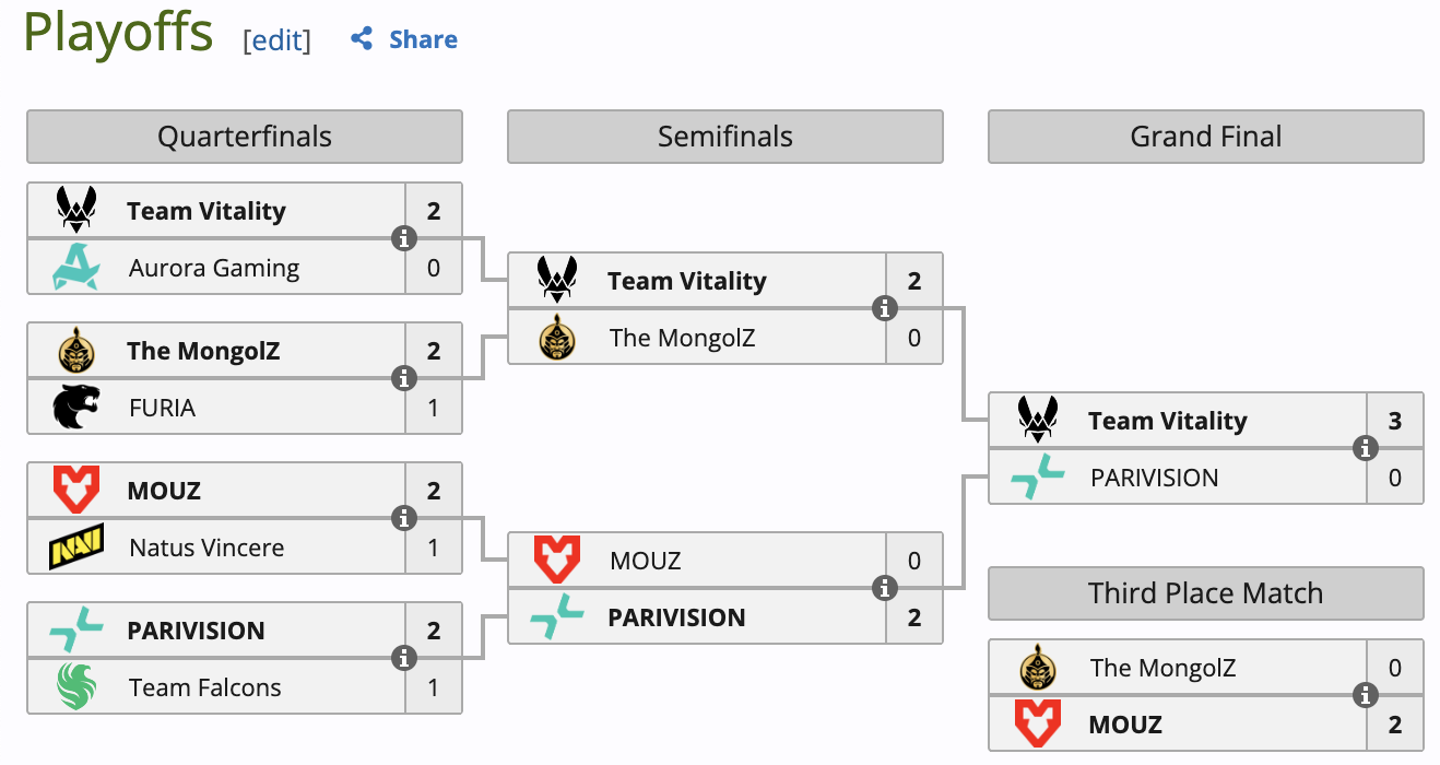 Улмаар хасагдах шатны тоглолтоо Бразилын "FURIA" багтай хийж 2-1 (Mirage 13-3; Dust2 10-13; Nuke 13-10) харьцаагаар хожиж хагас шигшээд шалгарсан бол дараа нь Европын холбооны "Team Vitality" багтай тоглож 0-2 (Mirage 13-16; Dust2 3-13; Nuke 0-0) харьцаагаар хожигдож гуравдугаар байрын төлөө тоглох болсон юм.