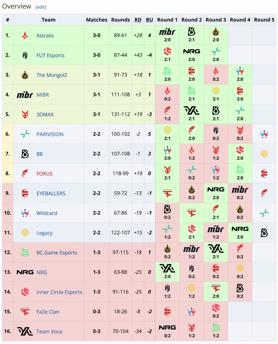 Манай залуусын эхний тоглолтоо Олександр Костыльев "s1mple"-ээр удирдуулсан Португалын "BC.Game Esports" багтай хийж 2-0 (Dust2 13-3; Ancient 13-11; Nuke 0-0) харьцаагаар, Шведын "EYEBALLERS" багтай тоглож 2-0 (Overpass 13-7; Mirage 13-7; Inferno 0-0) харьцаагаар хожиж хоёр хожилтой болж шигшээ шатанд шалгарахын төлөө мөн адил хоёр хожилтой байгаа Данийн "Astralis" багтай тоглож 0-2 (Mirage 4-13; Ancient 9-13; Nuke 0-0) харьцаагаар хожигдсон юм.