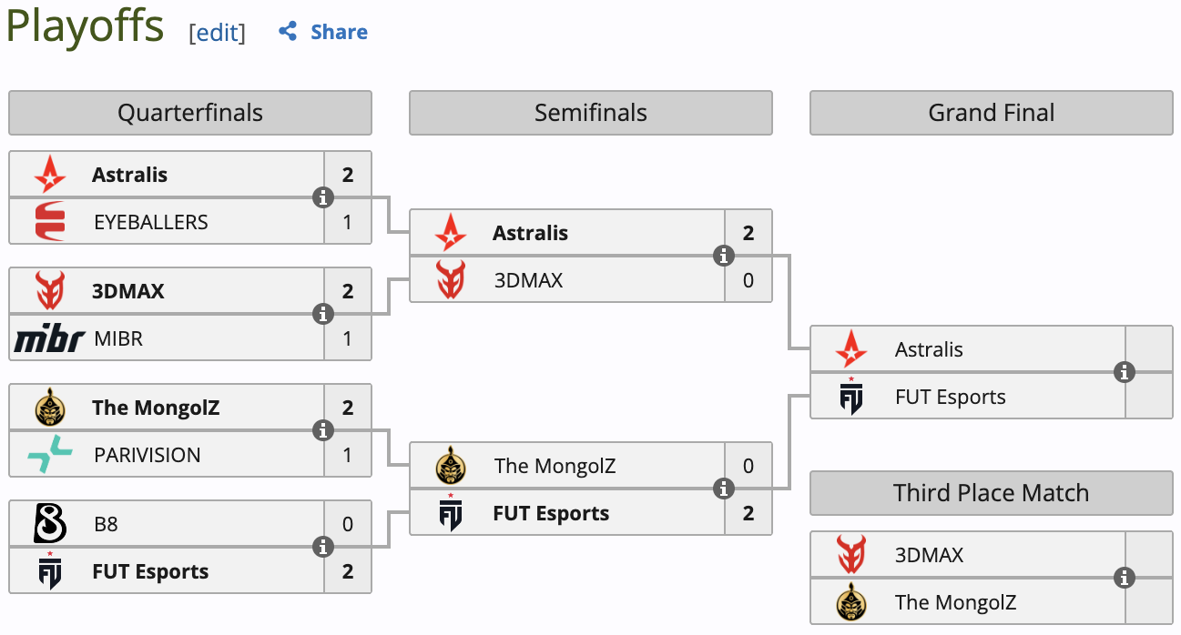 Шилдэг найман багийн хасагдах шатны тоглолтод ОХУ-ын "PARIVISION" багтай тоглож 2-1 (Dust2 6-13; Mirage 13-8; Ancient 13-9) харьцаагаар хожиж шилдэг дөрөвт шалгарч үлдээд байсан юм.