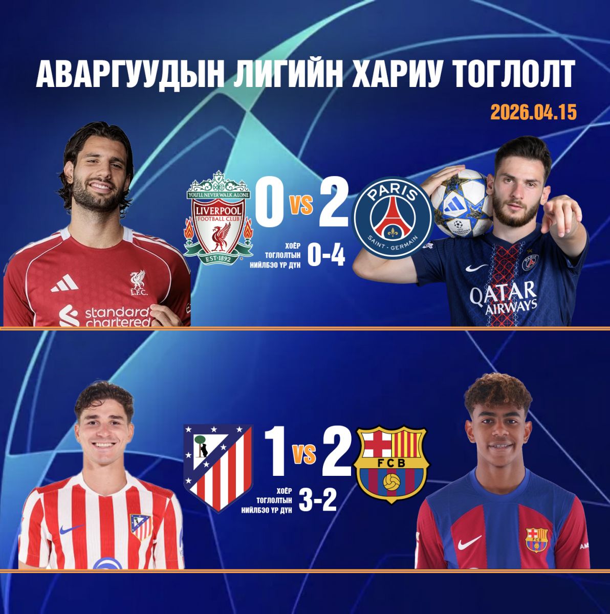 Хөлбөмбөгийн хамгийн нэр хүндтэй тэмцээн болох Аваргуудын лигийн шилдэг найман багийн хариу тоглолтууд өнгөрсөн шөнө боллоо. Өнгөрсөн жилийн аварга баг Францын "Парисен Жермен" клуб Английн "Ливерпүүл" клубын талбайд зочилж 0-2 харьцаагаар аваргууд хожлоо. Улмаар хоёр тоглолтын нийлбэр дүнгээр 0-4 харьцаагаар хагас шигшээд шалгарлаа.