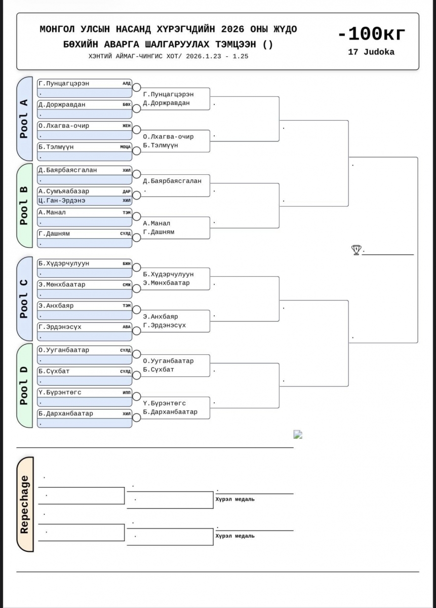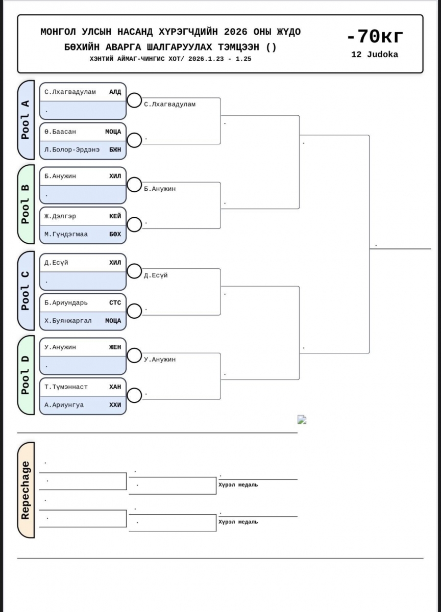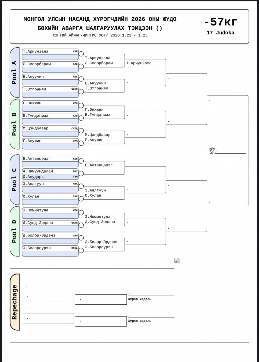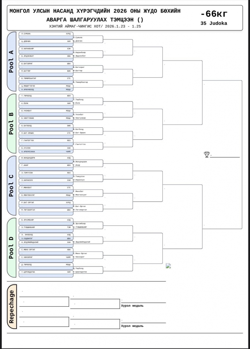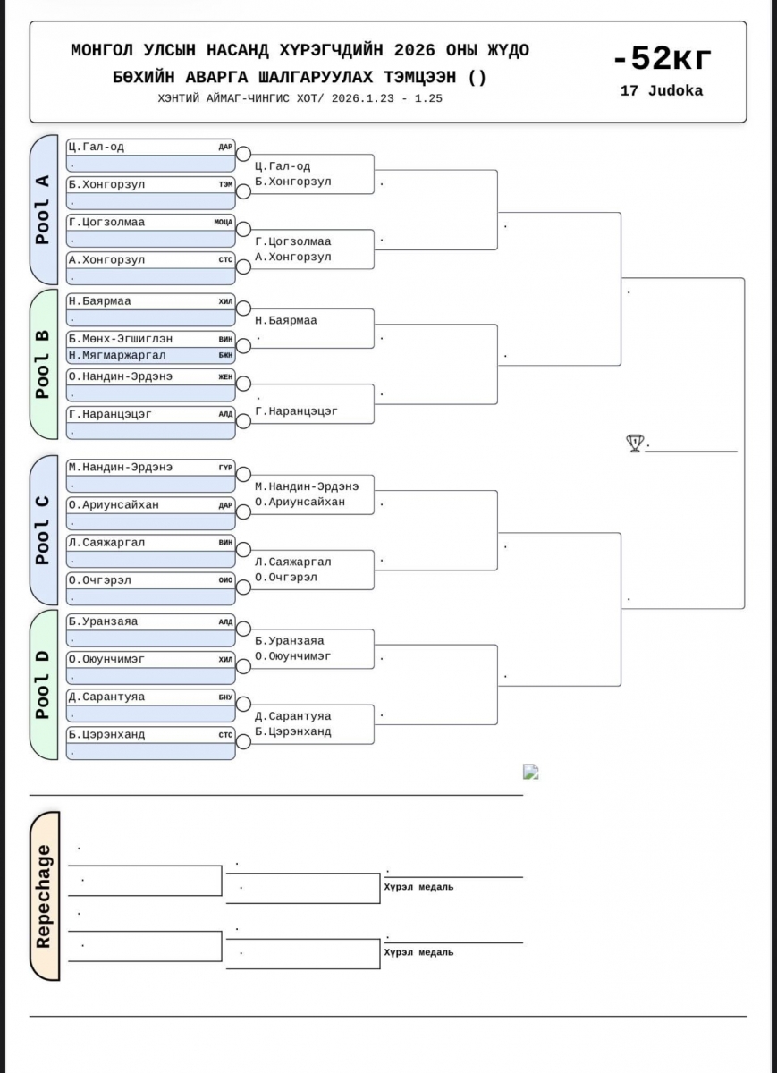 Хэнтий аймгийн Чингис хотод нэгдүгээр сарын 23-26-ны өдрүүдэд жүдо бөхийн насанд хүрэгчдийн улсын аварга шалгаруулах тэмцээн болно. Энэ удаагийн УАШТ-д эрэгтэй 212, эмэгтэй 105, нийт 317 тамирчин оролцохоор мэдүүлгээ өгчээ.