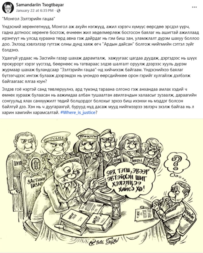 Тэрээр “…Монгол Зэлтэрийн гацаа” гэж гарчиглаад “…Үндэсний хөрөнгөтнүүд, Монголын аж ахуйн нэгжүүд, ажил хэрэгч хүмүүс өөрсдөө эрсдэл үүрч, гадна дотноос хөрөнгө босгож, өчнөөн жил хөдөлмөрлөж босгодог. Тэгж босгосон баялаг нь ашигтай ажиллаад ирэнгүүт нь “…Улсад хураана, төрд авна” гэж дайрдаг нь гэм биш зан, уламжлалт дүрэм шахуу боллоо доо. Эхлээд хэвлэлээр гүтгэж олны дунд хаяж өгч “Ардын дайсан” болгож нийгмийн сэтгэл зүйг бэлдэнэ. Удахгүй урдаас нь Засгийн газар шахаж дарамталж, хажуугаас цагдаа дуудаж, дэргэдээс нь шүүх прокурорт хэрэг үүсгээд, бөөрнөөс нь татвараас элдэв шалгалт оруулж, дээрээс хууль дүрэм журмаар шахаж буландсаар “Зэлтэрийн гацаа”-нд хийчихэж байгаа юм. Үндэснийхээ баялаг бүтээгчдээс ингэж булааж дээрэмдэх нь үнэндээ өөрсдийнхөө орон гэрийг хулгайлж дэлбэлж байгаагаас ялгаа юун. “…Элдэв гоё нэртэй санд төвлөрүүлнэ”, “…Ард түмэнд тараана олгоно” гэж анхандаа амлана. Гэсэн хэдий ч өмнөх хурааж булаасан нь аажимдаа албан тушаалтан авилгачдын халаасыг зузаалж, дараагийн сонгуульд ялах санхүүжилт төдий болж хоцордог. Ийм болохыг эрхээ биш ихэнх нь мэддэг болсон байлгүй дээ. Хэн нь ч дуугарахгүй, бурууд нүд дасаж мууд нийгмээрээ эвлэрч эхэлж байгаа нь л харин хамгийн харамсалтай” хэмээжээ. Эндээс үзвэл, ийм хэлэлцээ ихэвчлэн Засгийн газрын санаачилгаар эхэлдэг. Гэхдээ яагаад дуусдаггүйн учир энд л байх шиг байна. Учир нь, нөгөөх хувийн хэвшлийг хэлэлцээ нэрээр урдаа суулгаж байгаад цагдаа, прокурор, татвараар айлган дарамталдаг байна. Мэдээж, нийгмийн сэтгэл зүй нэгэнт тэдний эсрэг чиглээстэй болохоор хэлэлцээний ширээнд биш шүүгдэгчийн сандалд суучихсан шиг л болно. Товчхондоо, “…Хэлэлцээ” гэдэг нь дээрэм болон хувирч, тэр нь “Монгол Зэлтэрийн гацаа” үүсгэдэг аж.