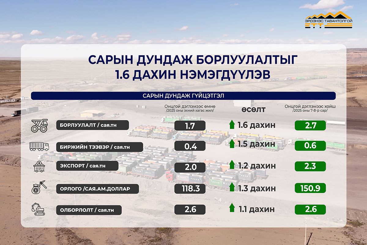 “Эрдэнэс Тавантолгой” ХК-иас долоо, наймдугаар сарын ажлын үзүүлэлт, үр дүнгийн мэдээллийг өнөөдрийн Засгийн газрын хуралдаанд танилцууллаа. Монгол Улсын Засгийн газрын 2025 оны 07 дугаар сарын 09-ний өдрийн 26 дугаар тогтоолоор томилогдсон онцгой бүрэн эрхт төлөөлөгчийн баг хоёр сарын хугацаанд борлуулалт, экспорт, тээврийг оновчтой зохион байгуулж ажилласны үр дүнд компанийн үндсэн үзүүлэлтүүд сайжирсан. Тухайлбал, компанийн сарын дундаж борлуулалтыг 1.6 дахин, биржийн тээвэрлэлтийг 1.5 дахин, экспортыг 1.2 дахин, орлогыг 1,3 дахин нэмэгдүүллээ.