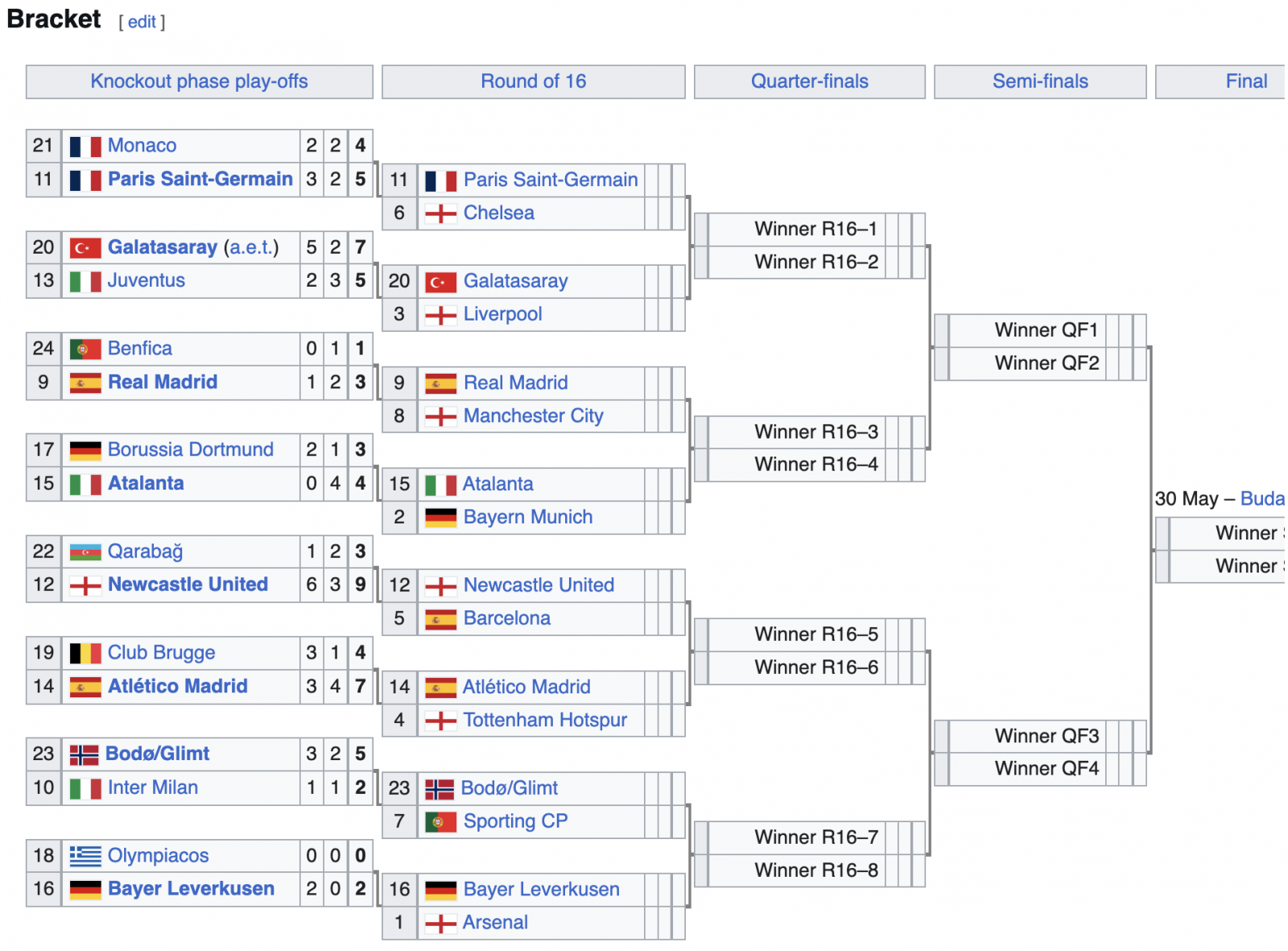 Оноолтод өнгөрсөн жилийн аварга баг Пари Сен-Жермен клуб Английн Челси клубтэй гуравдугаар сарын 11-ний шөнийн 04:00 цагт тоглох бол тус цагт мөн Испаний Реал Мадрид болон Анлийн Манчестер Сити клубүүд тоглох юм.